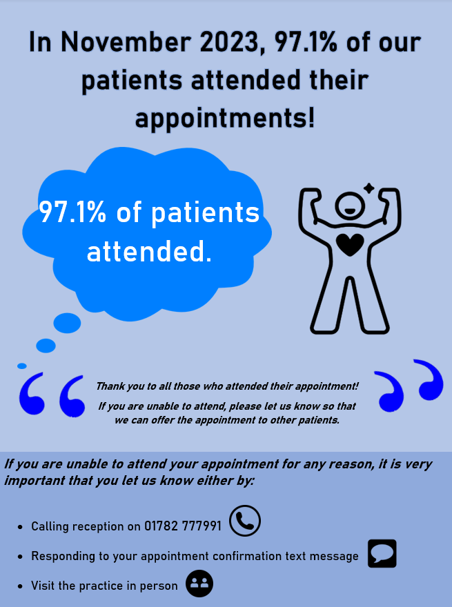 It makes a dramatic difference to us here at Mount Road Practice & also to the NHS as a whole, if you inform us in good time that you are unable to attend your appointment, we then may be able to offer the slot to another patient.